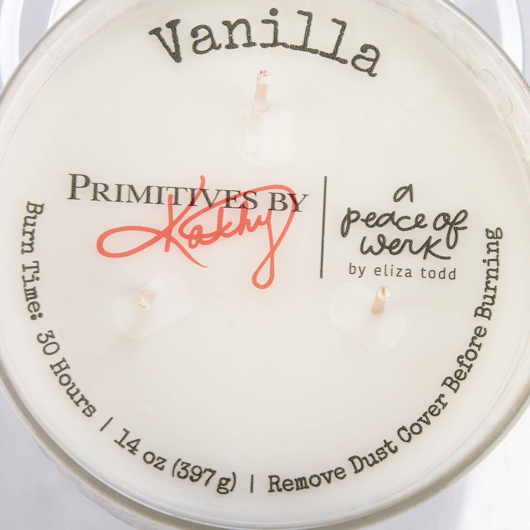 Candle features soy-based wax and 3 fabric wicks with 30 hours of burn time activating a calming Vanilla scent.