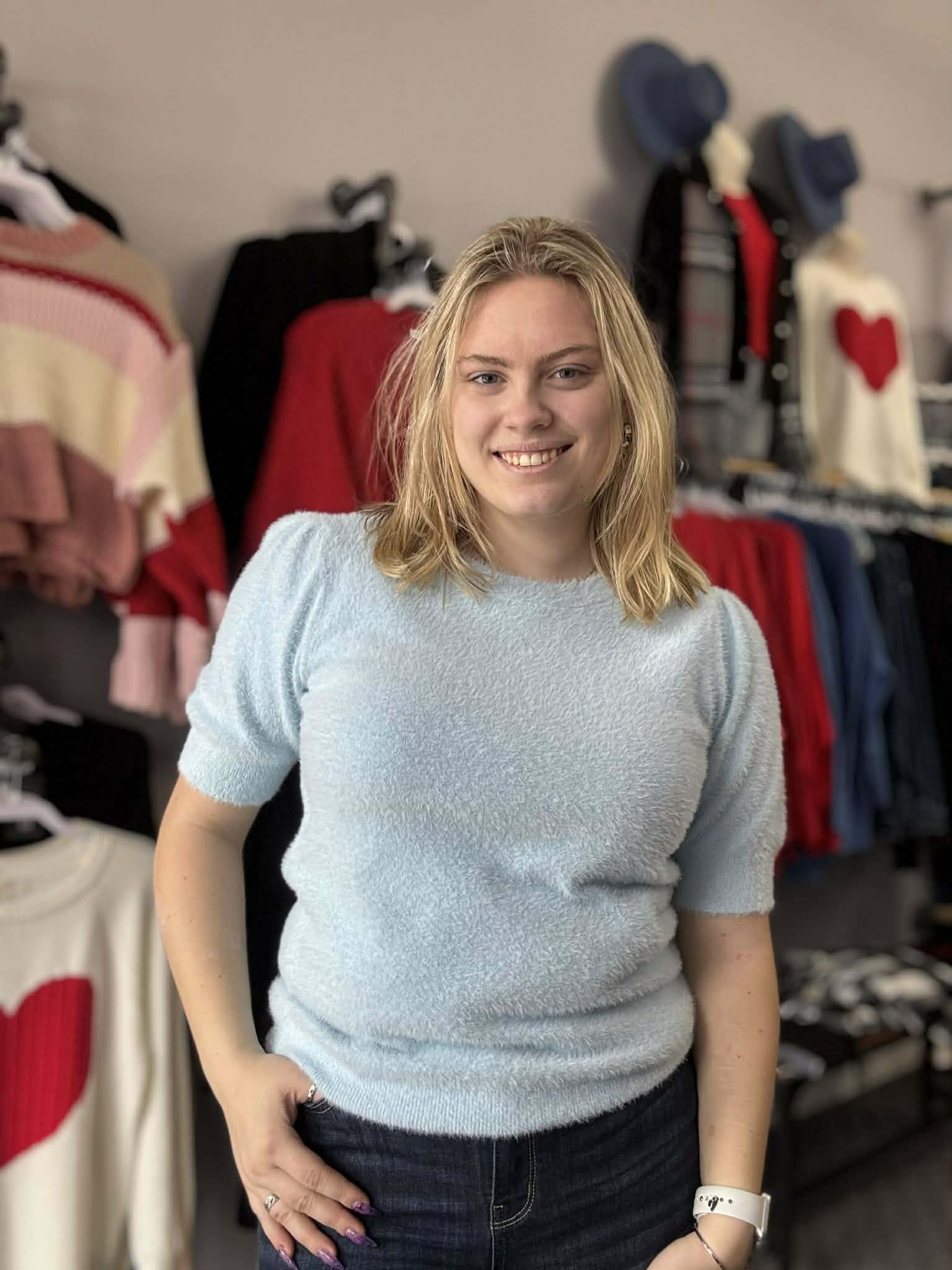 Alaina is wearing the Small.