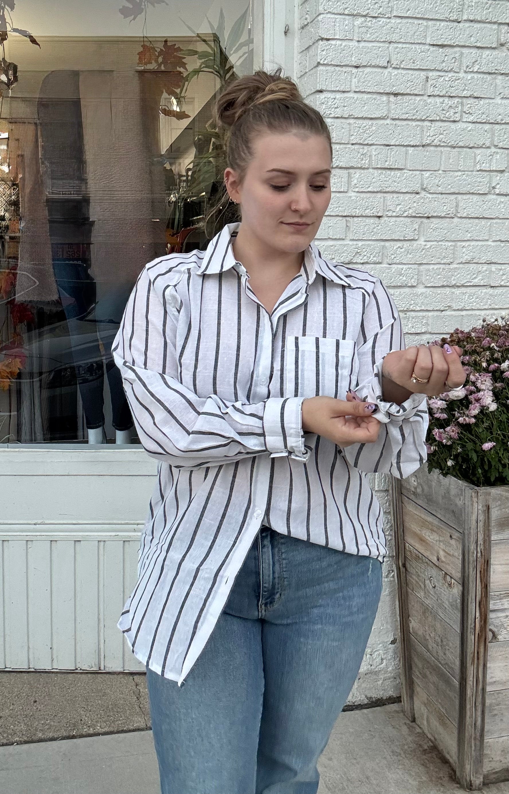 This classic stripe button-up shirt is soft, lightweight and breezy. The chest pocket adds extra detail and style. Throw it on over a tank, swim suit or bralette for an effortless look. Shaped hemline makes this collared shirt more stylish.